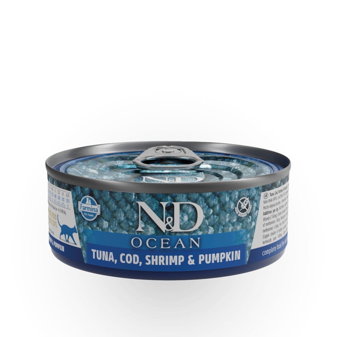 Farmina N&D Gato Comida Húmeda Ocean combina la frescura del mar con ingredientes de alta calidad para ofrecer a tu gato una alimentación equilibrada y sabrosa. Cada porción contiene atún, bacalao y gamba, complementados con calabaza, un ingrediente rico en fibra que favorece la digestión. La textura húmeda y apetitosa de esta comida ayuda a aumentar la ingesta de agua, promoviendo una hidratación adecuada, esencial para la salud urinaria de tu felino.