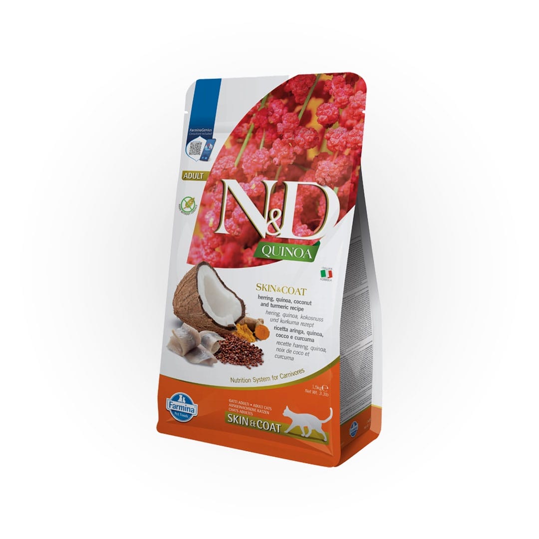 Farmina N&D Gato Pienso Quinoa – Piel y Pelaje – Arenque y Coco es un alimento premium desarrollado para satisfacer las necesidades nutricionales específicas de los gatos adultos que requieren apoyo para su salud dérmica y calidad del pelaje. Su fórmula avanzada se basa en ingredientes naturales, utilizando quinoa como alternativa para proporcionar una digestión más suave y eficiente.