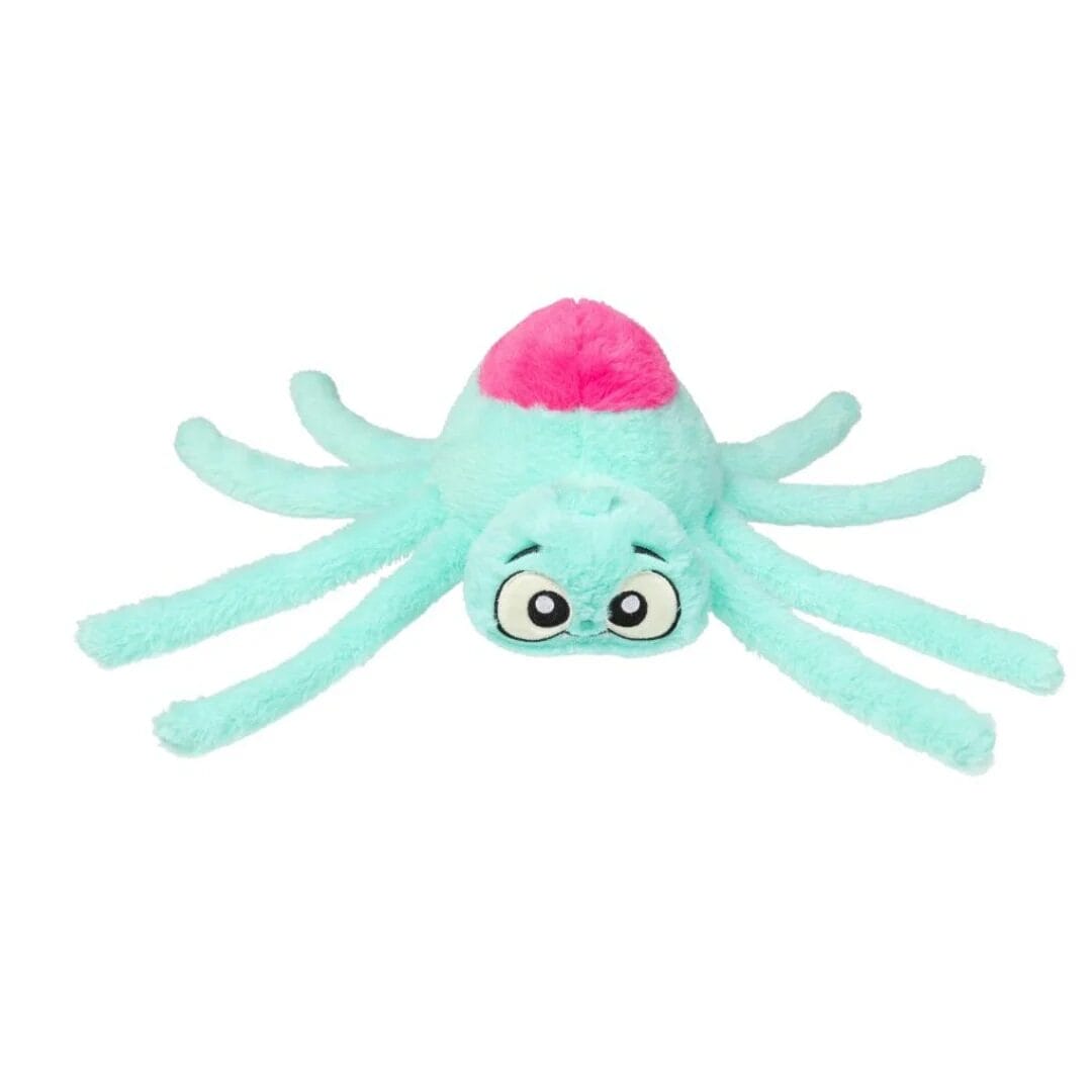 Una araña turquesa con abdomen rosa que aparece en Halloween para provocar juegos de persecución y mordisqueos divertidos. Webigail incluye un pito interno que despierta la curiosidad de tu perro. Confeccionada en poliéster suave, no tóxico e hipoalergénico, y lavable a máquina en agua fría.