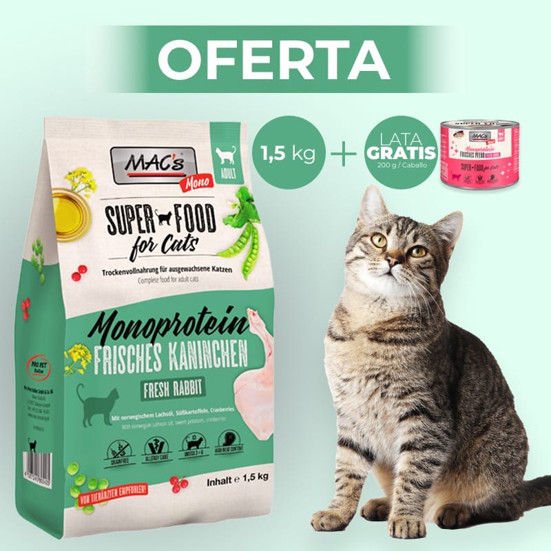 - Monoproteico: El uso exclusivo de carne de conejo como fuente de proteína lo hace adecuado para gatos con sensibilidades alimentarias.