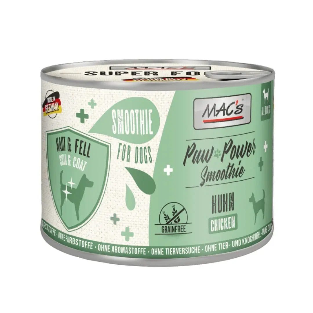 MAC’s Perro Paw Bebida Energética Pollo puede contrarrestar el pelaje opaco o desgreñado. La levadura de cerveza que contiene, por ejemplo, no sólo hace que la piel sino también el cabello sea más resistente y el aceite de salmón proporciona un pelaje brillante. La harina de algas nutre el pelaje y la piel, los músculos y el tejido conectivo, fortalece el funcionamiento normal del sistema inmunológico y favorece la flora gastrointestinal.