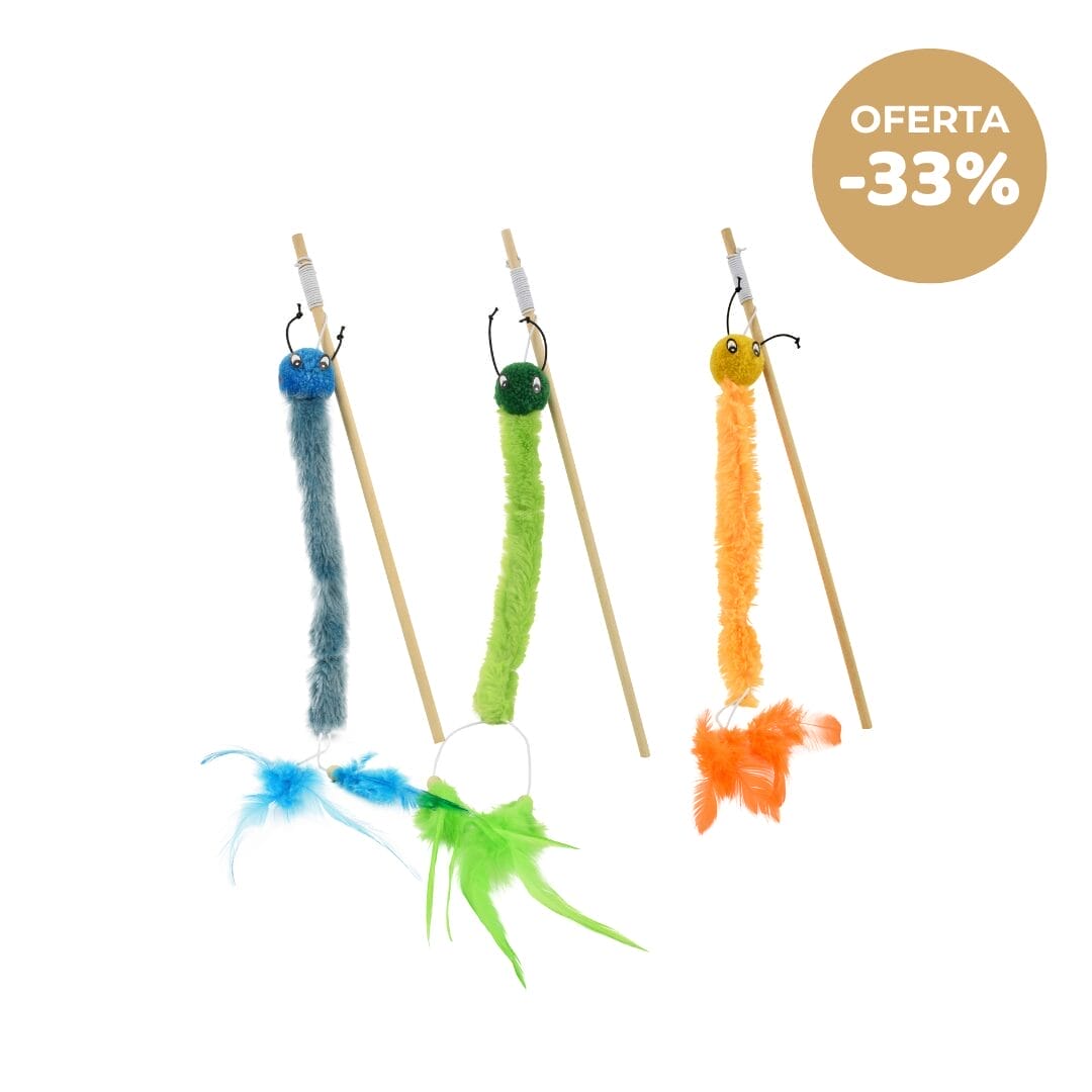 Este juguete de vara con peluche y plumas ha sido diseñado para ofrecer una experiencia de juego estimulante y segura. Con una longitud de 40 cm, permite una distancia adecuada para que puedas mover el juguete sin riesgo, mientras tu gato salta, corre o acecha como si se tratara de una presa real.